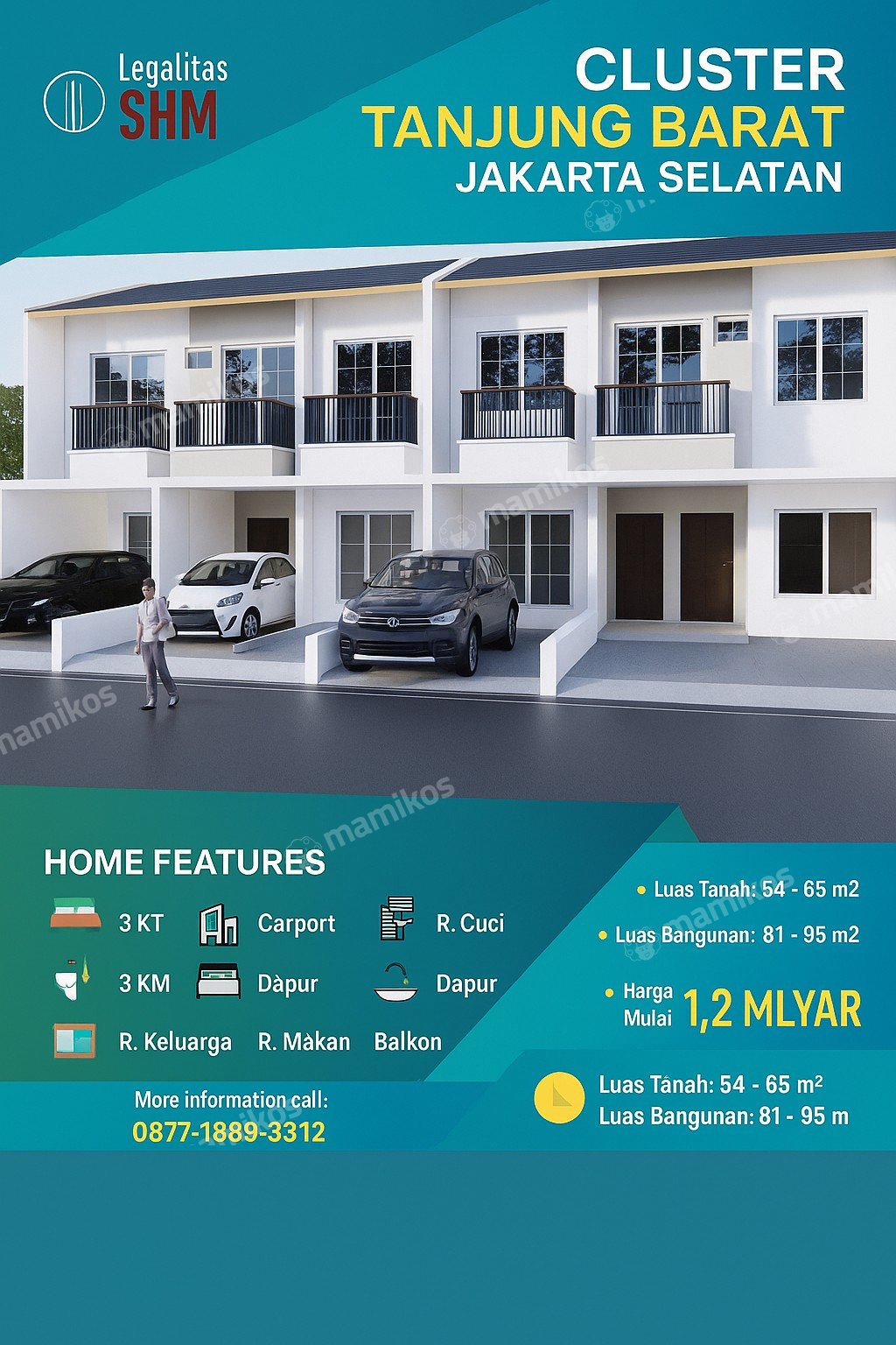 Harga Mulai dari 1,2 Milyar !!! Cluster Tanjung Barat Baru RUMAH BARU!! Lokasi Jl. Tanjung Barat, Pasar Minggu, Jakarta Selatan mengusung konsep rumah milenial modern memaksimalkan ruang dan lahan, design yg mewah dan modern, dengan bahan bangunan yg terbaik dikelasnya standard indonesia. kemudahan akses ke pusat pusat perekonomian maupun perkantoran, dekat dengan rumah sakit dan pusat perbelanjaan, milikilah segera hunian yg anda idamkan sekarang juga. Spesifikasi: Pondasi plat beton Dinding heabel (2 dinding) Lantai granit 60x60 Jendela aluminium Plafon gypsum Genteng multiroof Rangka baja ringan Luas tanah: 54 - 65 m² Luas Bangunan: 81 - 95 m² Int/eks: 3 Kamar Tidur 3 Kamar Mandi Ruang Keluarga Dapur Ruang Makan Ruang Cuci Carport (1 Mobil) 2 Lantai Balkon Legalitas SHM One Gate System Pembayaran: cash bertahap, cash keras